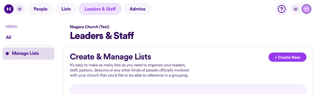 To view your leader lists, go to People. Then, click on Leaders & Staff.. Then click Manage Lists in the left sidebar.