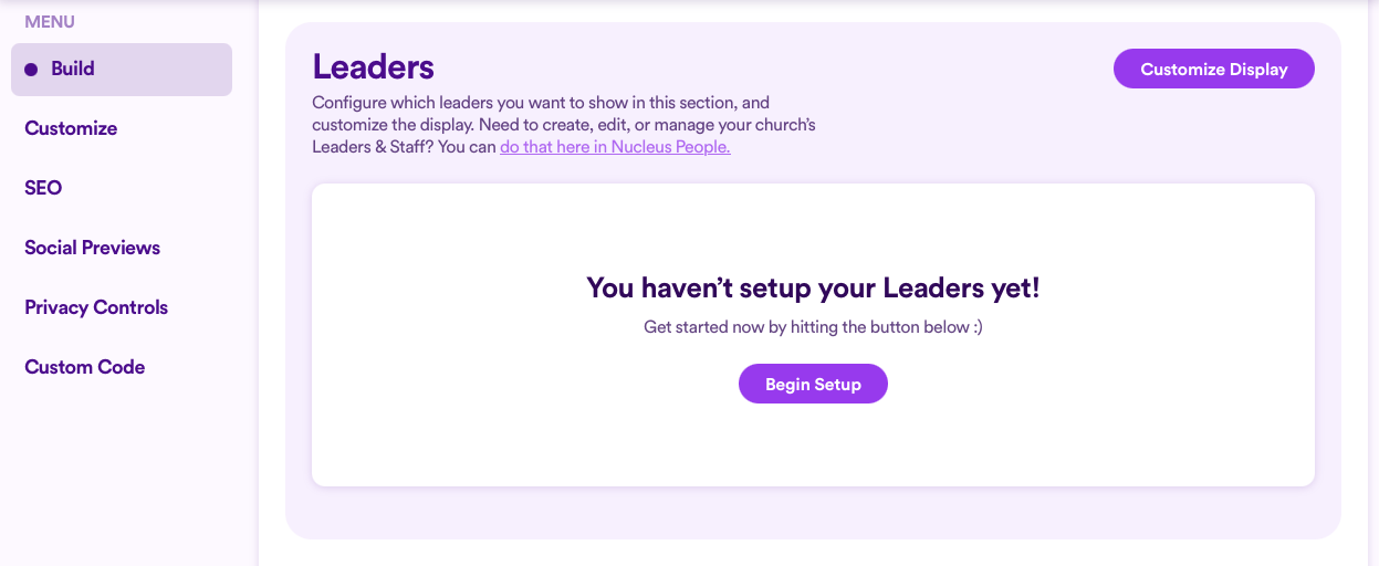 After having added a Staff & Leaders section, scroll down to Leaders, and click Begin Setup.