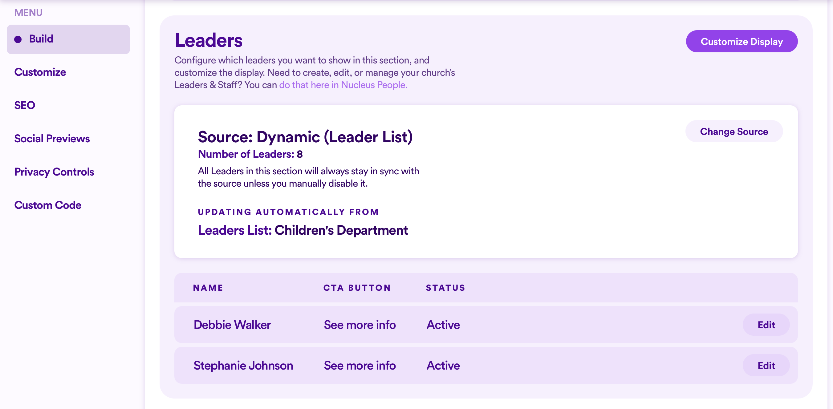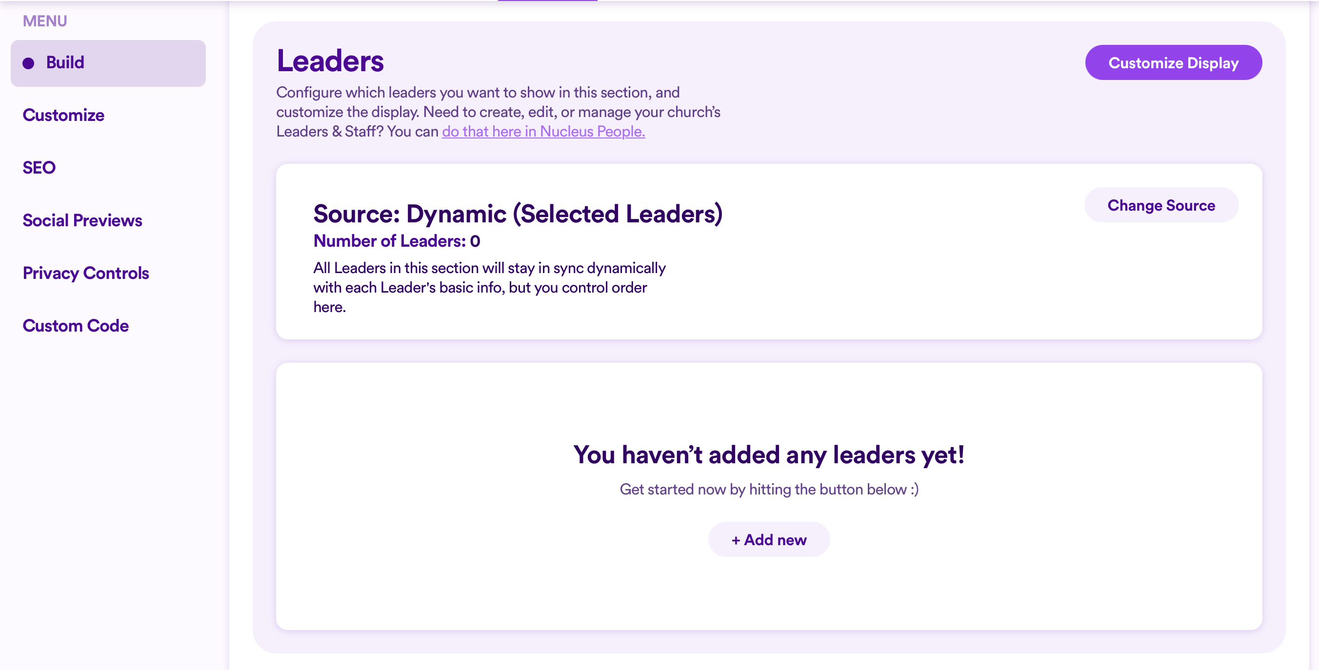As explained in this guide, Nucleus pages are built using sections. There are several types of sections to use, but we’ll focus on adding a Staff & Leaders Section to a page.