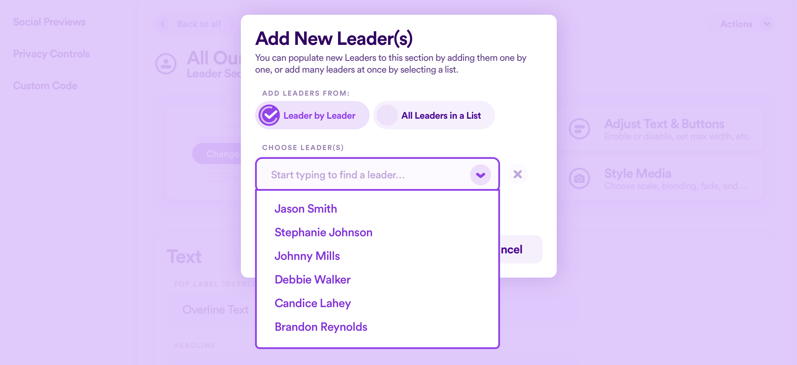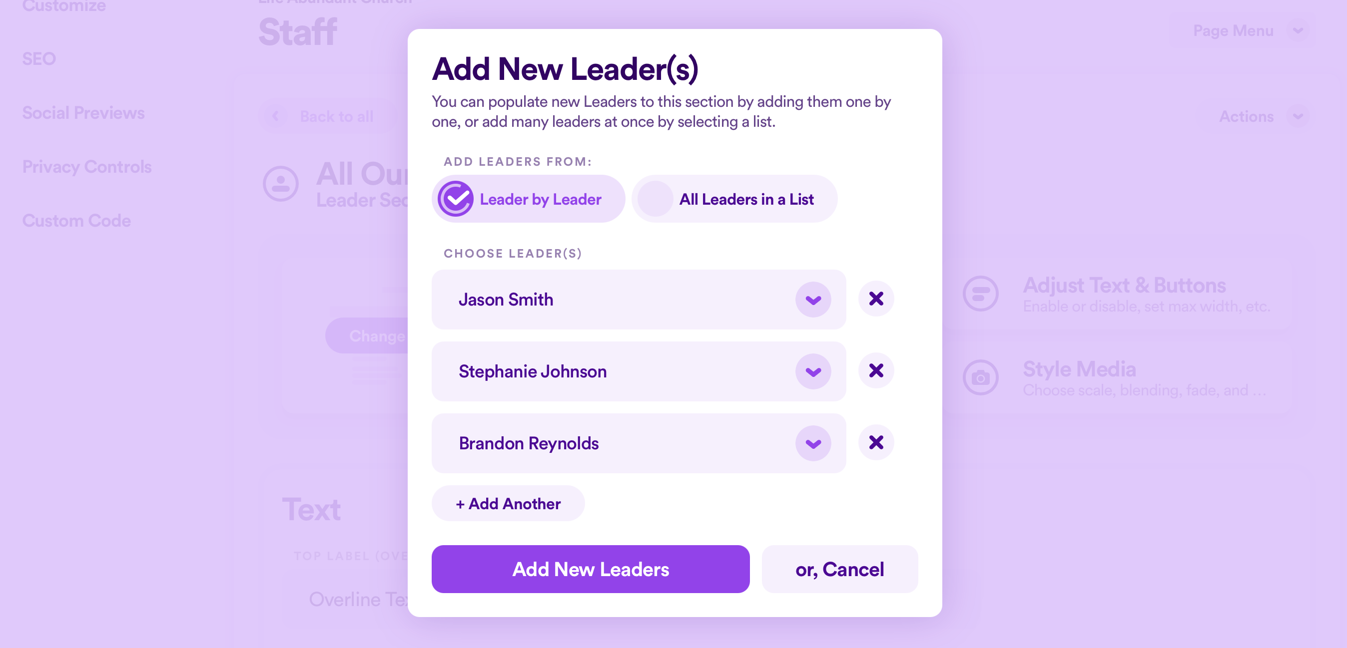 Note: This article will only focus on the unique functionality for the Staff & Leaders Section. To learn more about how to edit the layout and design of a section, click here.