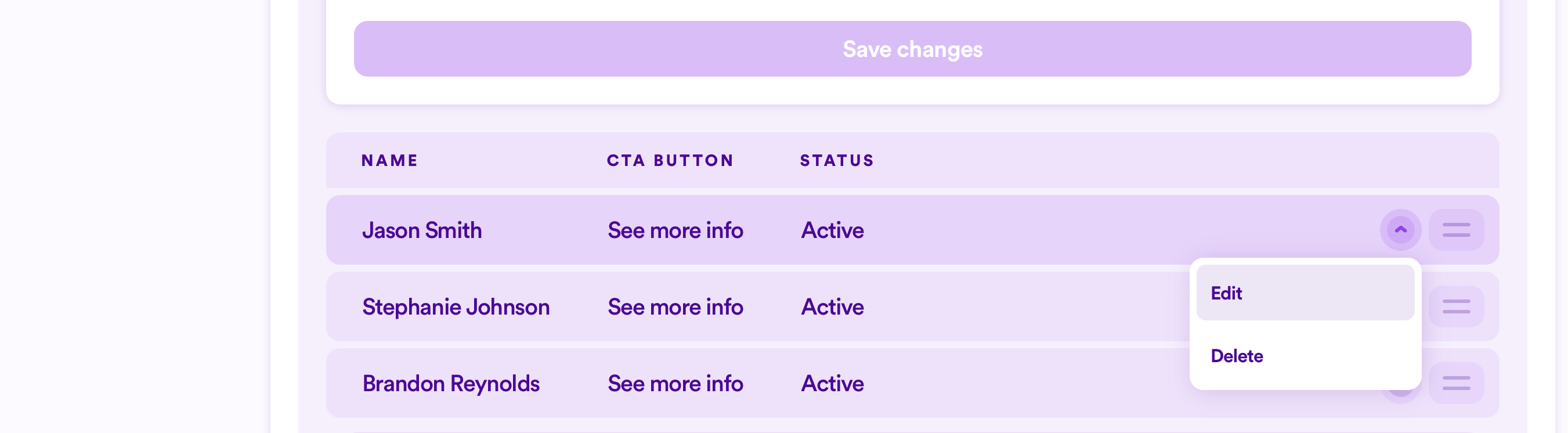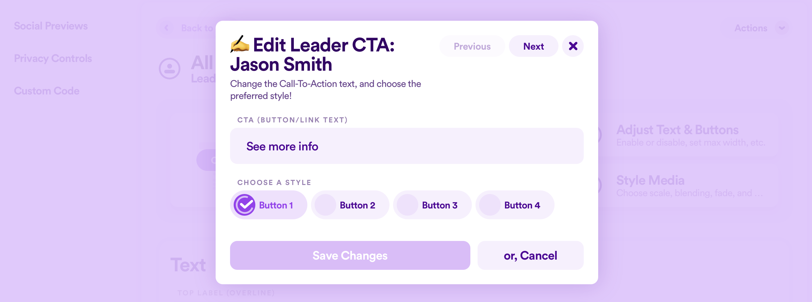 To change the text on each "See More Info" button as well as select the style each button appears as, click the down arrow on the far right of any person, and select Edit from the dropdown menu. (You can also Delete a person from your section as well.)