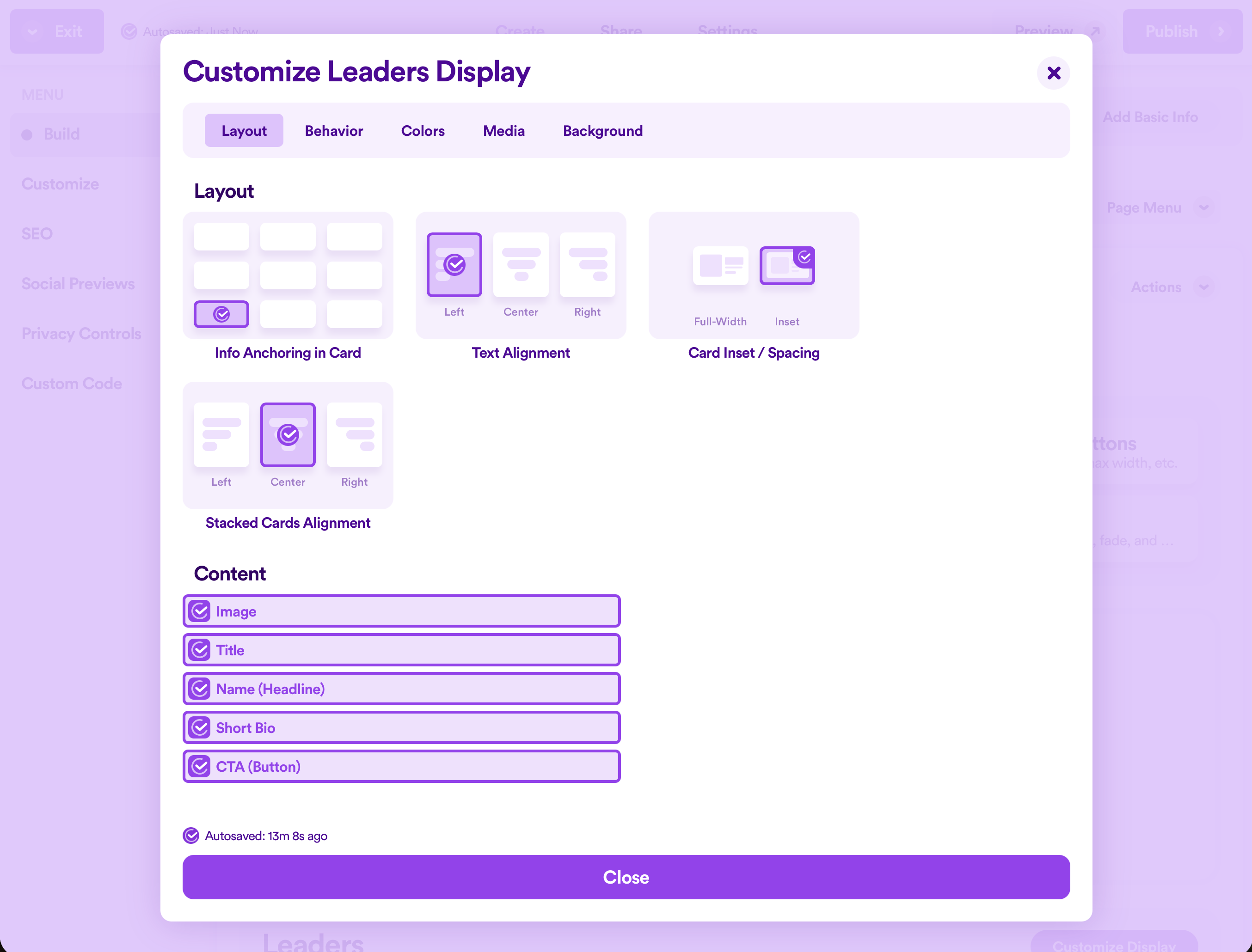 Almost everything in these settings are identical to the settings when customizing the display of cards in a typical Cards section. The only difference is in the Content that can be displayed, since the content here will be specific to staff & leaders. Otherwise, everything else is exactly the same.