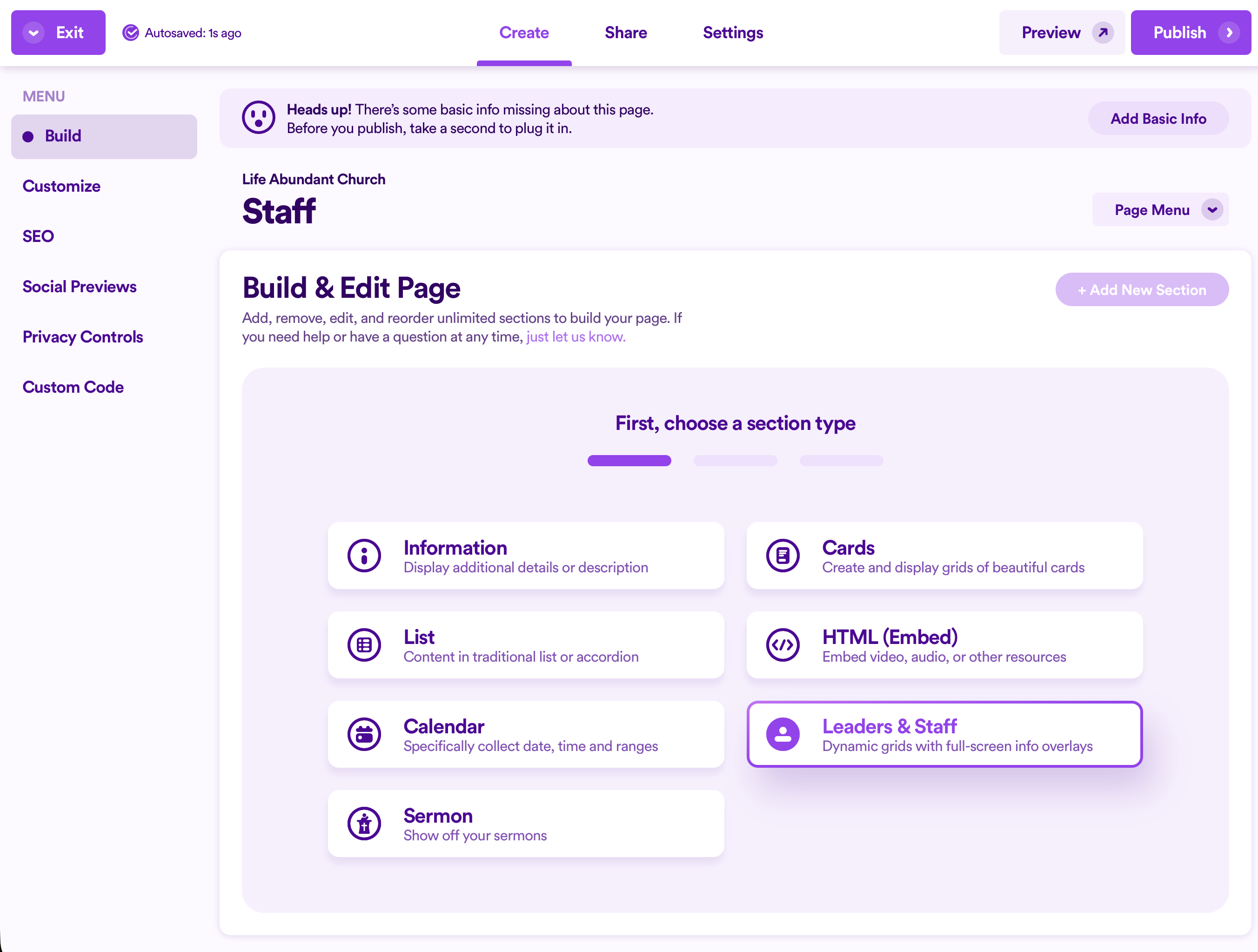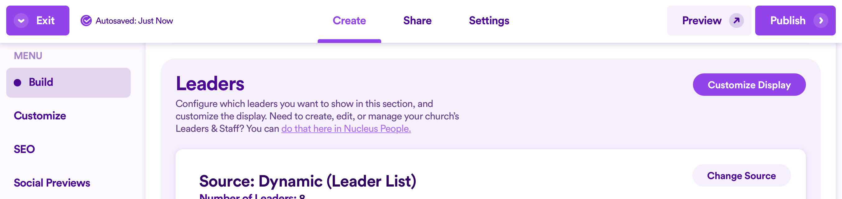 The Staff & Leaders Section isn’t the only type of section you can add to a page. Check out some of these other guides to learn about different types of sections you can add to a page in your Nucleus website: