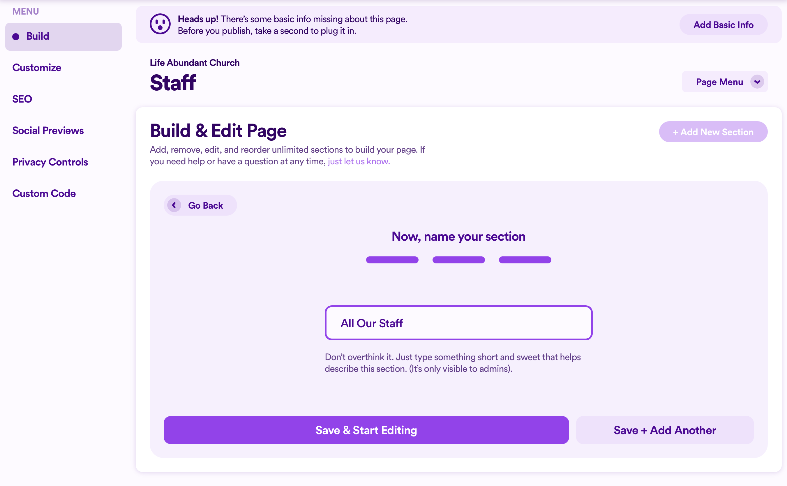 Note: Editing a section involves much more than focusing on the specific type of section. For instance, there are a slew of design and layout options you can choose for every single section you add to a page. This guide focuses specifically on the uniqueness of the Staff & Leaders Section.