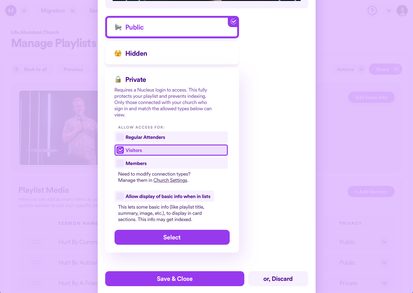 Either button will open up a space for you to edit the playlist's information. Here, you can add/edit the title and description, add an image, and below this adjust the playlist's privacy settings. When you're finished, click Save & Close at the bottom.