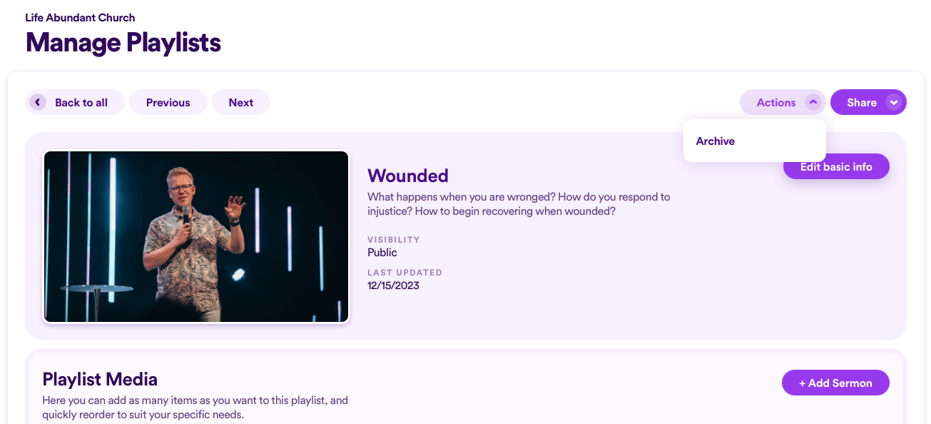 To archive the playlist, choose Edit on a sermon, then click on Actions and select Archive. Then to go back to your master list of all your playlists, click Back To All.