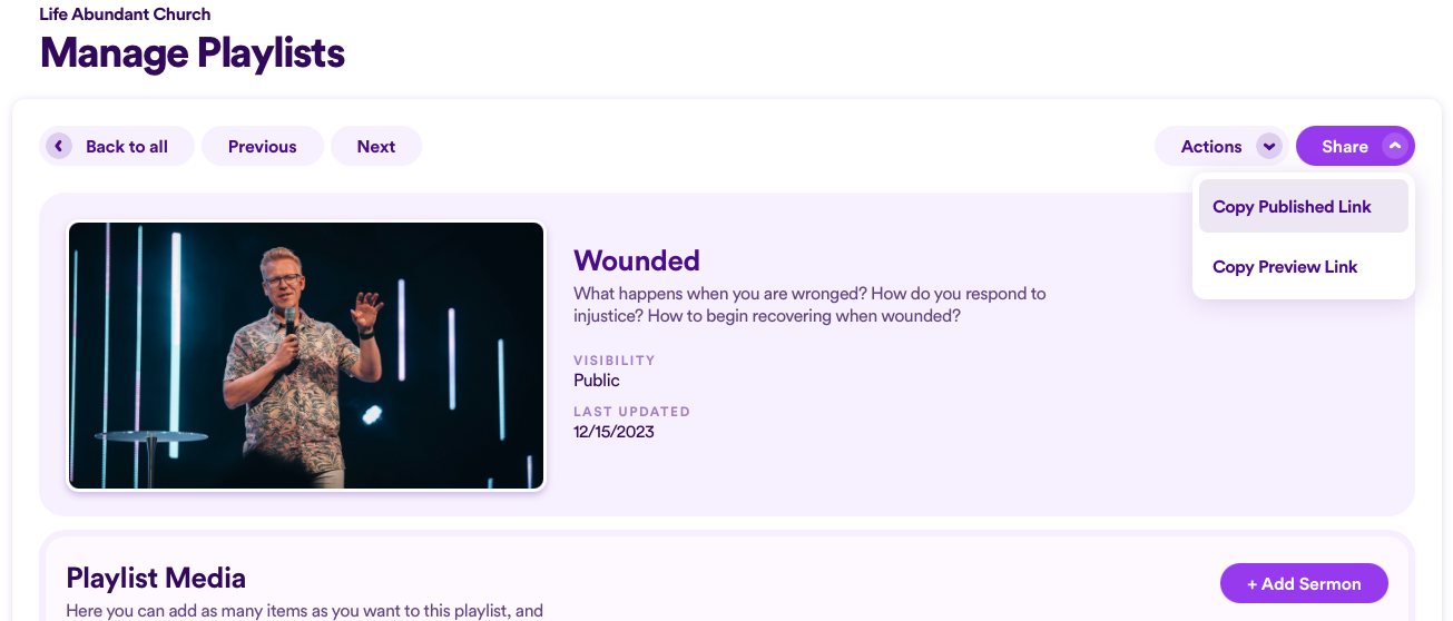 Playlists are a great way to group together sermons that belong together. Most of the time, this will likely be sermons that were preached together in succession as part of a sermon series. But you could also create playlists based on other criteria, like grouping all your previous Easter or Christmas messages together.
