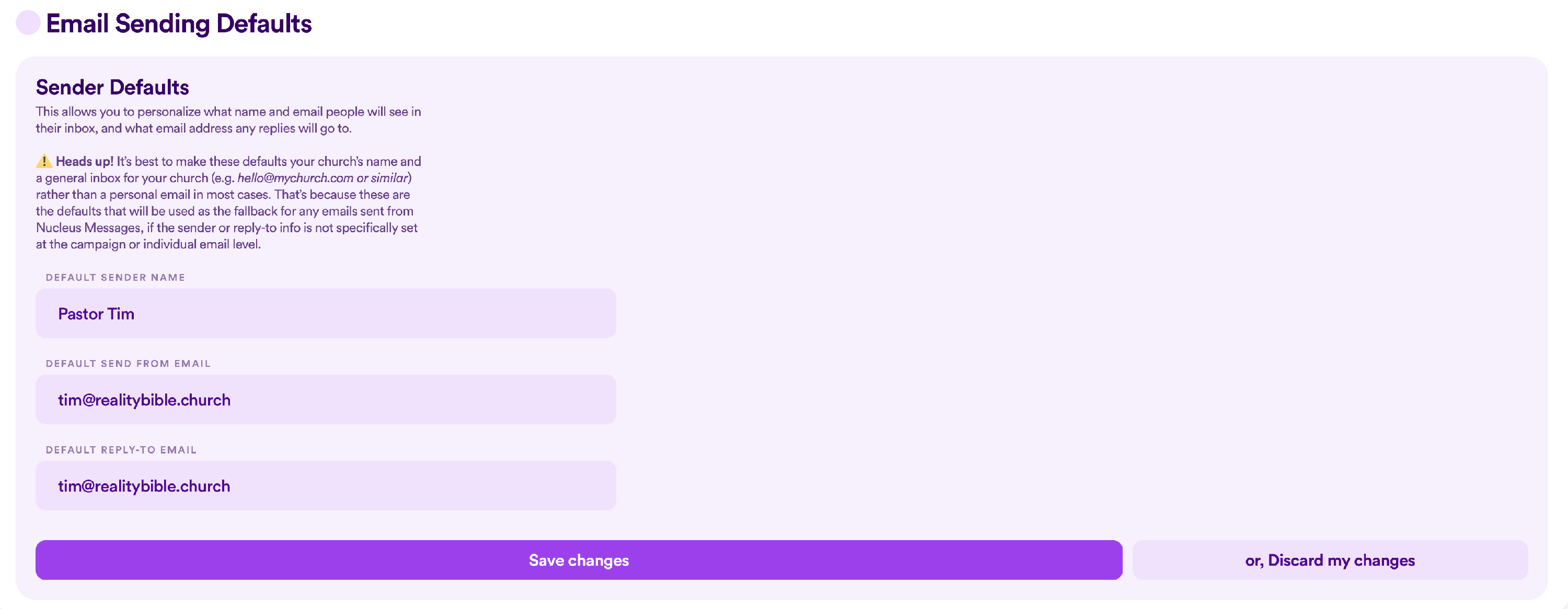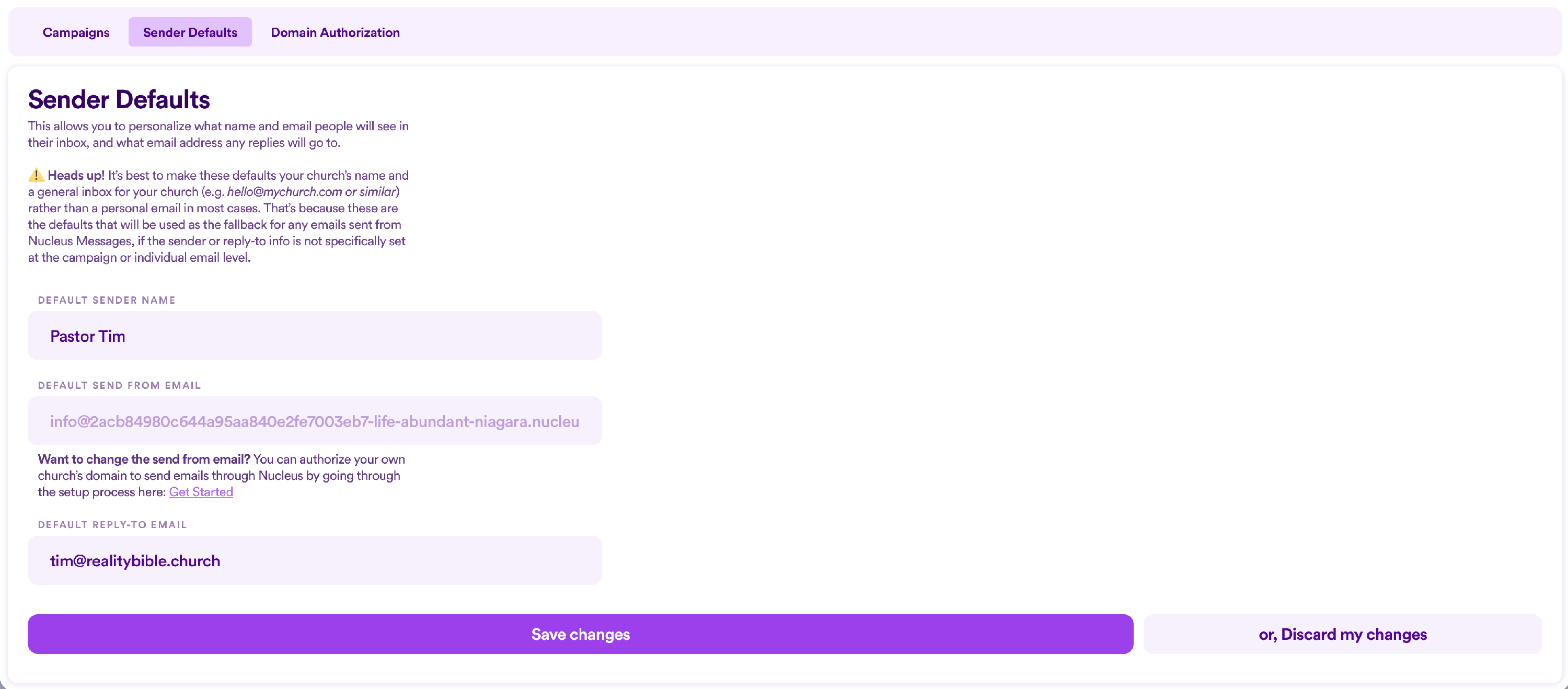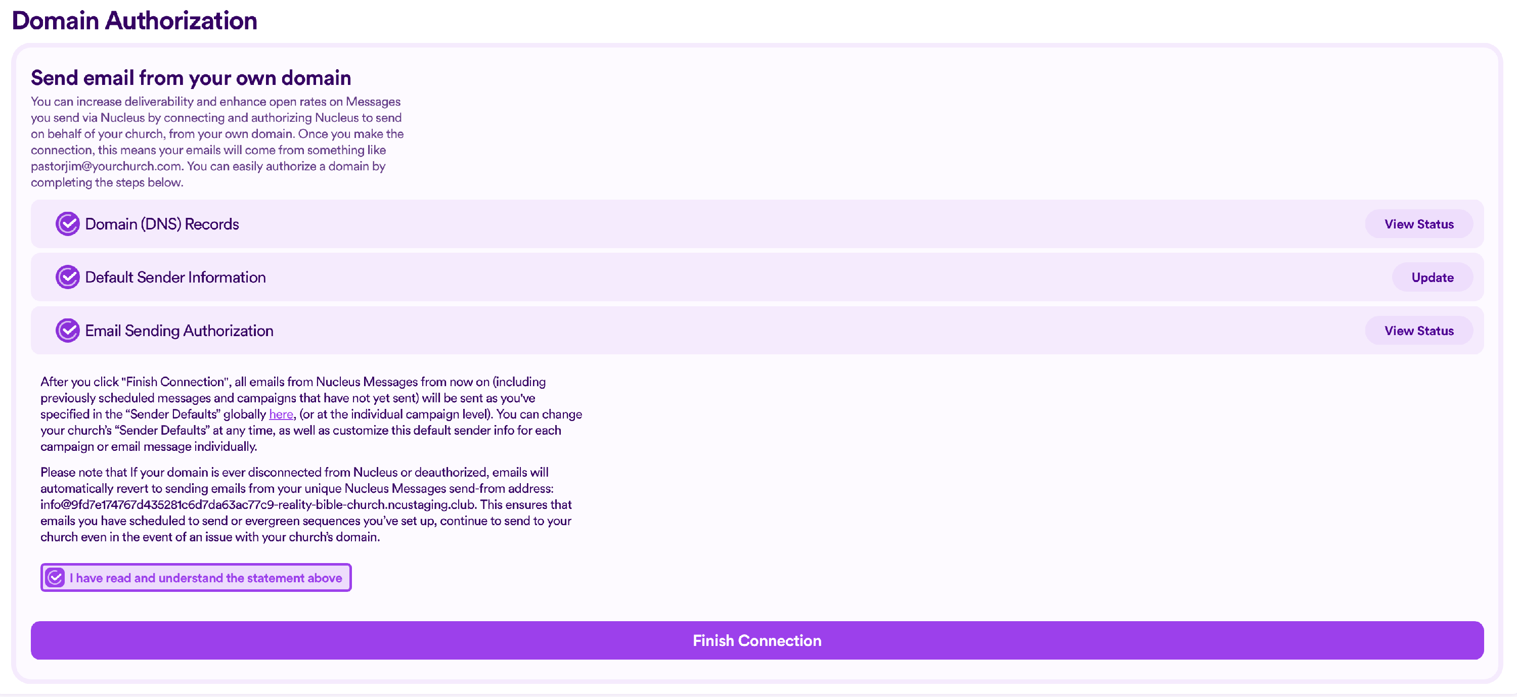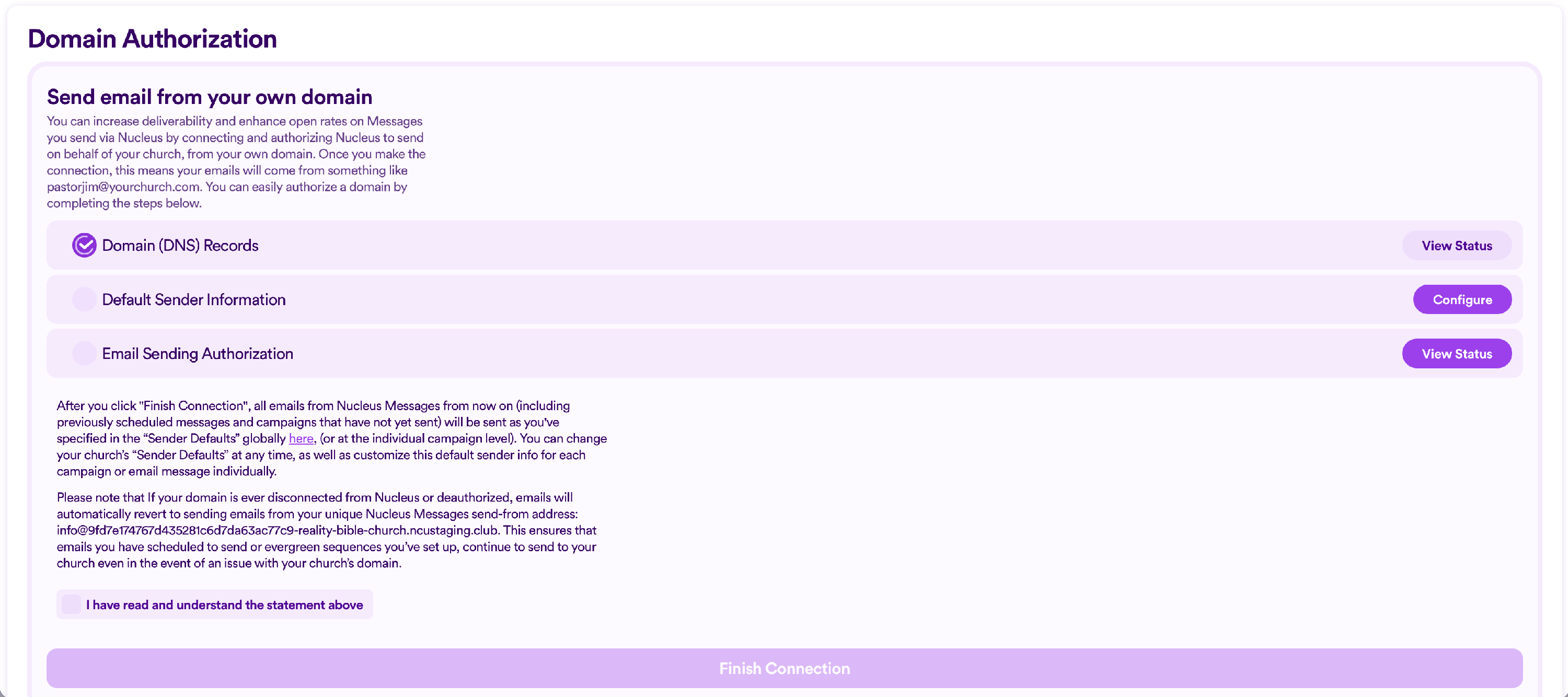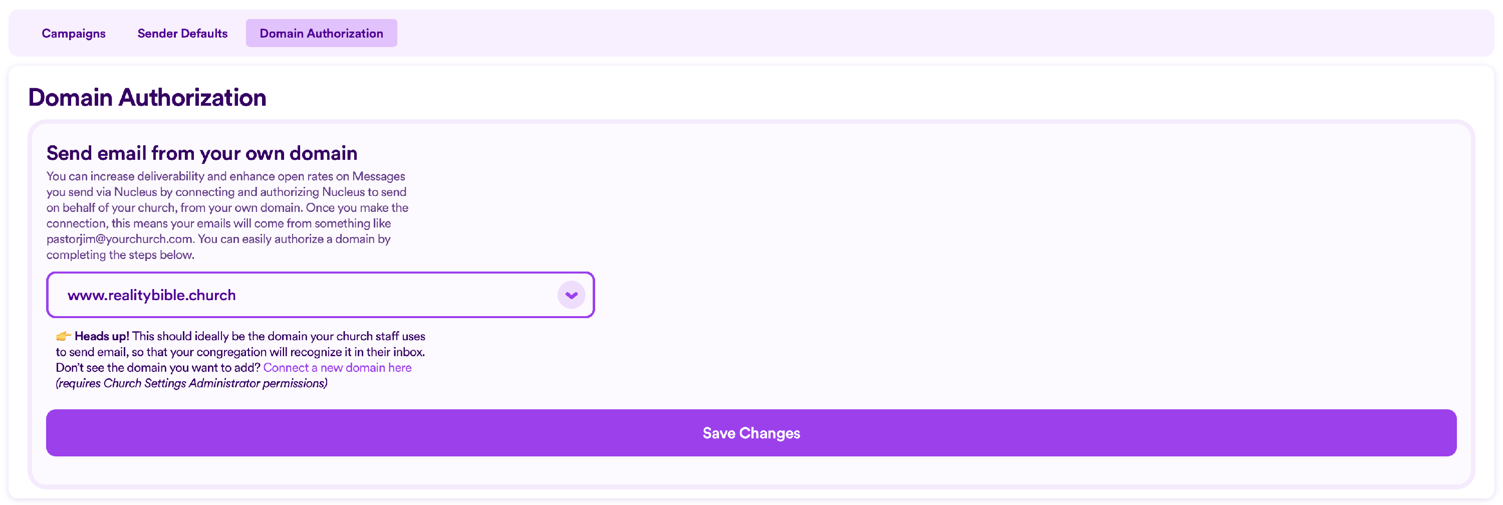 To configure connected Sender Defaults in Messages, you'll first need to ensure that your domain is successfully connected to your account through Nucleus Web (or Church Settings if you're not a Web user yet).