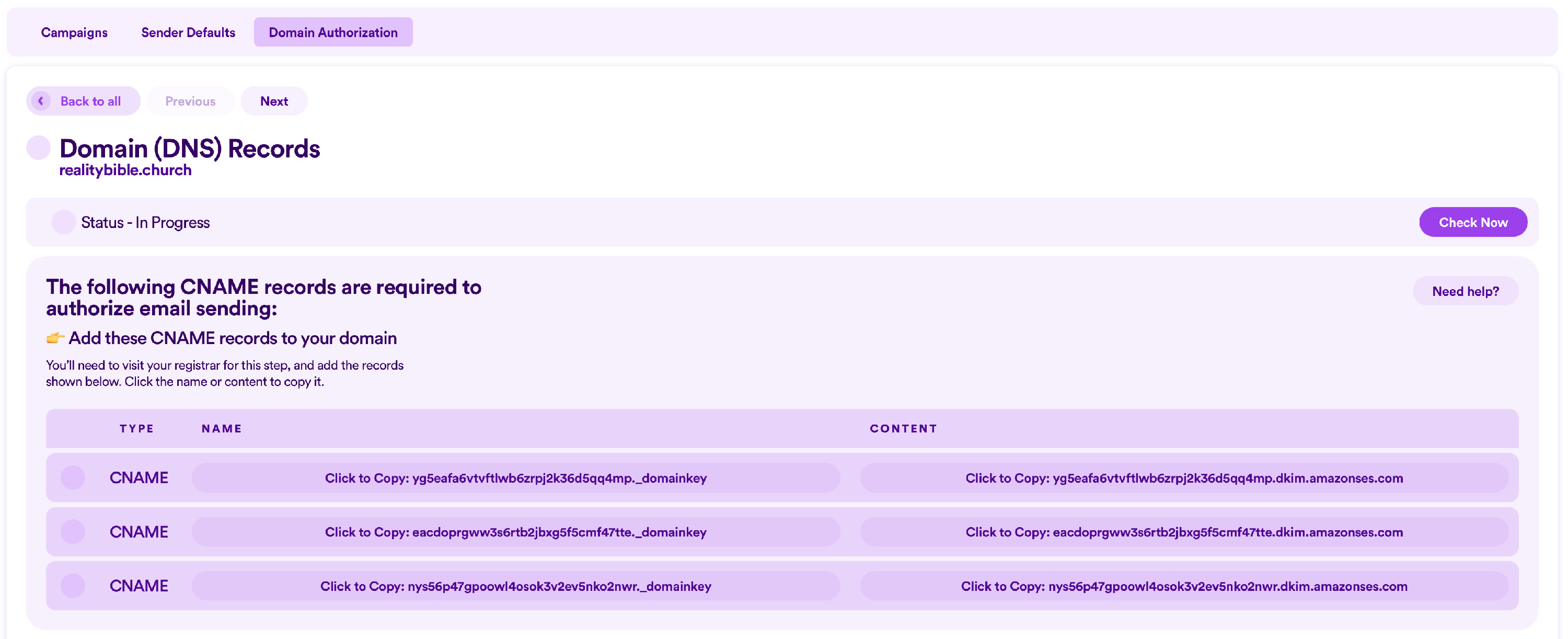 To verify the connection of your domain with Messages, click the Check Now button in your Settings. If the connection is good, after the circle spins a few times in the button, a checkmark should appear beside the Status.