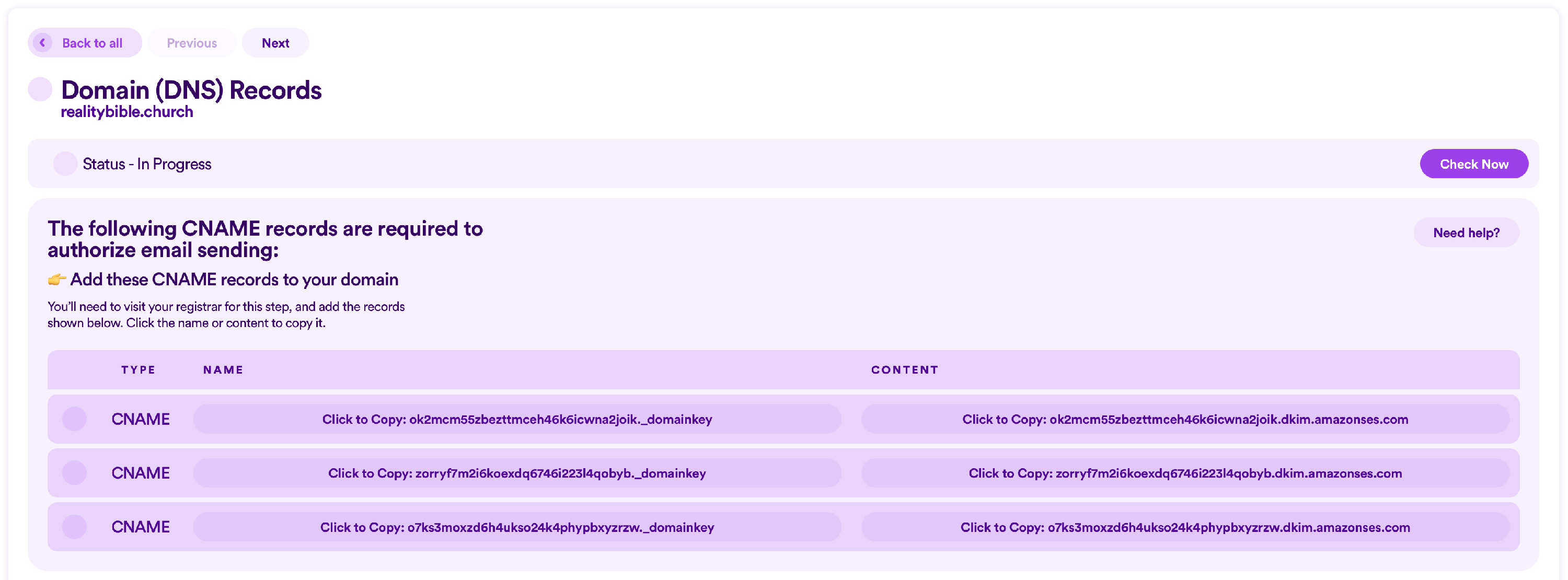 First, select the domain from the dropdown that you'd like to connect. We'll then generate the CNAME records you'll need to copy to connect that domain for sending Messages from Nucleus.